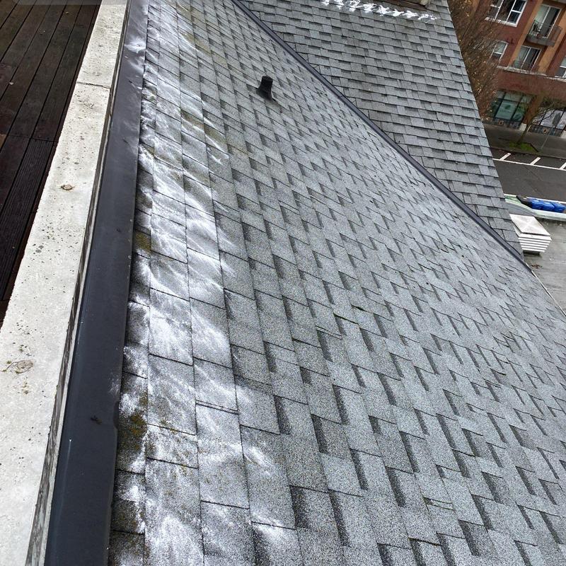 Endurant Roof applied a moss treatment in Seattle, WA. The team removed active moss and treated the surface to stop regrowth. This service protects asphalt shingles, prevents damage, and extends roof life by reducing surface moisture and organic buildup.