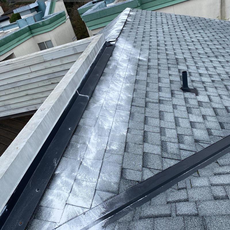 Endurant Roof installed shingles on a residential roof in Seattle, WA. The team secured wall flashing and panels and integrated underlayment for moisture protection. They prepared for the final layout by aligning ridge caps and trim to specifications for long-term durability.